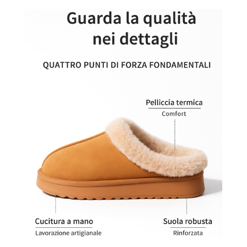 Ogni dettaglio delle SNOOVEE è pensato per offrire il massimo comfort: pelliccia termica, cuciture artigianali e suola rinforzata per durare nel tempo.